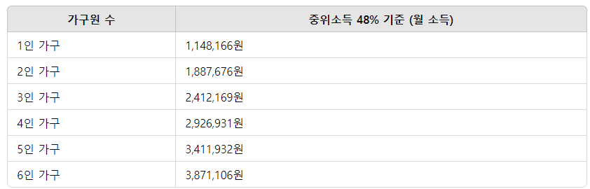 2025년 기준 중위소득이 6.42% 인상됨에 따라, 주거급여 지원 대상의 소득 기준도 상향되었습니다. 가구원 수에 따른 중위소득 48% 기준은 다음과 같습니다.